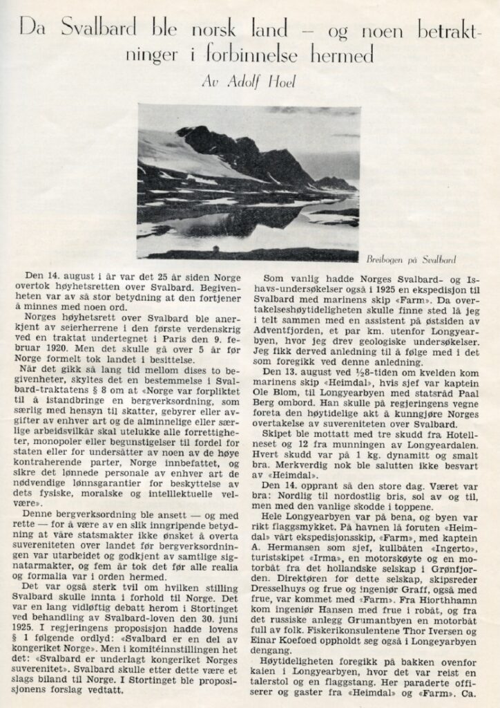 Den 14. august 2025 er det 100 år siden Svalbardtraktaten trådte i kraft. I den forbindelse gjengir vi her en artikkel fra Polarårboken 1950, der Adolf Hoel har noen betraktninger ved 25-årsjubileet for overtakelsen av suvereniteten over øygruppen.