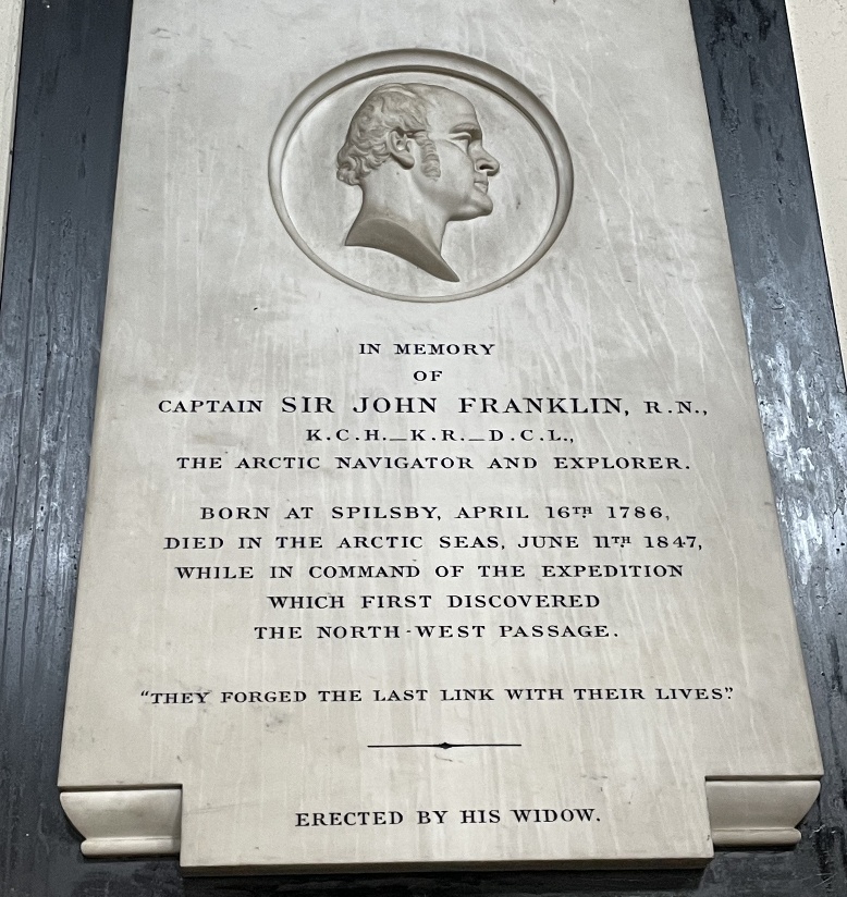 Jeg var på en «road trip» rundt i England sammen med min sønn på leting etter gamle gravsteder m.v. som kunne assosieres med våre familieaner tilbake til 1700/1800-tallet. Vi startet på kirkegården i en liten landsby i Lincolnshire som heter Hundleby og gransket alle de gamle gravsteinene etter vår forfar som ble begravet der i 1749. Kanskje som ventet var de eldste gravsteinene blitt uleselige. Noen minutters gange nedover veien var man plutselig i Spilsby, som er en litt større småbynabo og jeg vandret rundt på kirkegården i tilfelle graven kunne ha havnet der. På grunn av pågående reparasjonsarbeid i kirken fikk jeg gå inn og der på veggen hang minnetavlen til Franklin – som ble født i Spilsby i 1786. Hvordan kunne jeg ha oversett det!