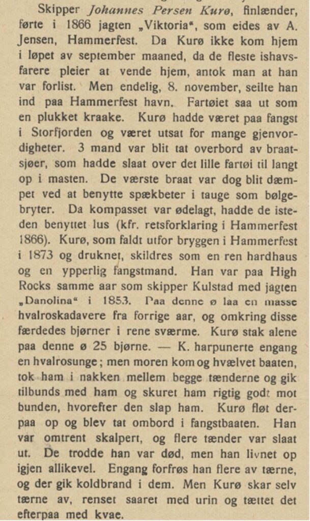 Her beretter han om den finskfødte skipperen Johannes Persen med etternavn Kurø/Kyrö/Gurrho som skrives på flere måter avhengig av hvilket språk det oppgis på dvs. norsk/finsk/kvensk. Dersom vi kan tro på det som skrives så var Johannes Persen Kurø (1820-1873) ganske mye tøffere enn de fleste andre.