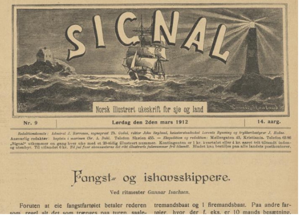 Gunnar Isachsen var en av Norges fremste polare oppdagere og kartleggere. Han ble senere i livet direktør for Sjøfartsmuseet. Isachsen var spesielt opptatt av ishavsferdene til de ulike norske fangstskutene. Han samlet opp alt han kom over av dagbøker og loggbøker og publiserte oversikter over hva disse skipperne hadde utrettet. I tidsskriftet Signal fra 2. mars 1912 skrev han om Fangst- og ishavsskippere.